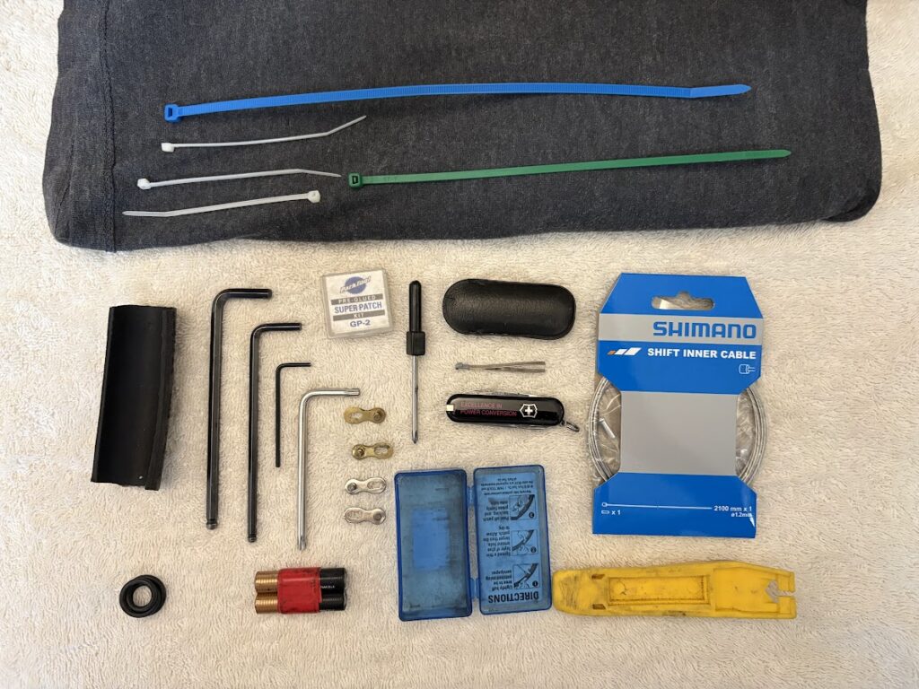 - Small Swiss Army knife with a tweezer (to remove wires from tires)