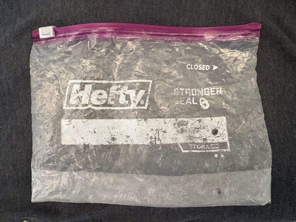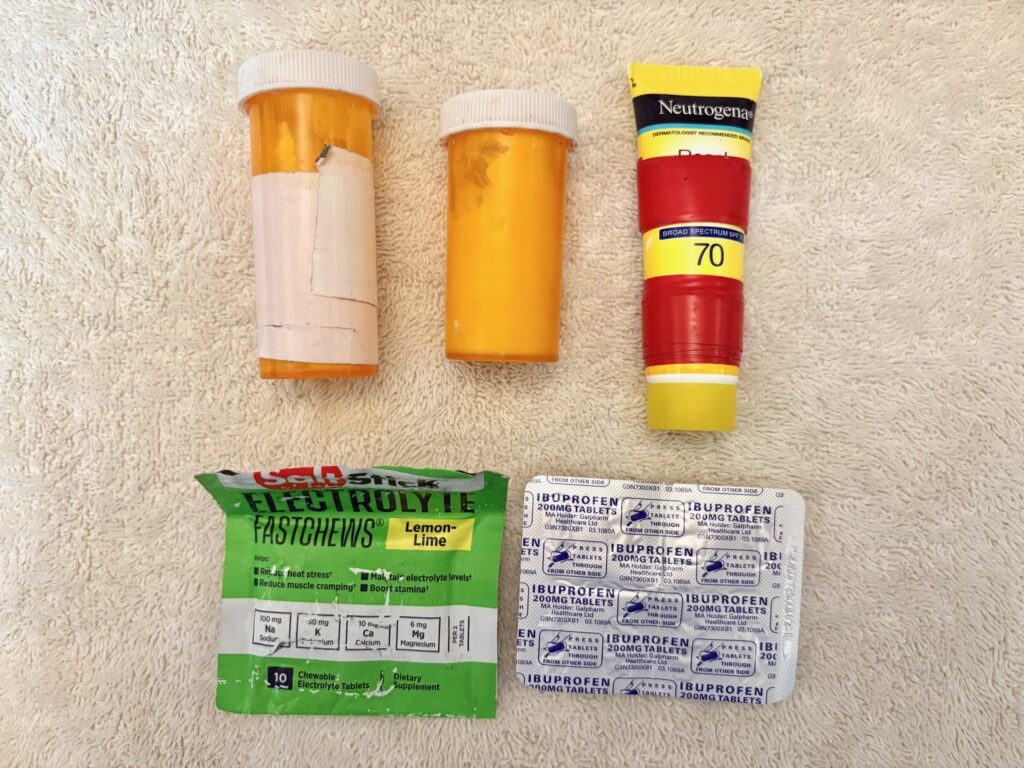 My kit contained antacid tablets (not in photo), ibuprofen, electrolyte pills, chamois cream and sun block. I filled empty pill bottles with the chamois cream so I could easily carry on in my handlebar bag for access for mid-ride touch-up. I packed a spare bottle in my saddle bag. When I accessed my drop bag, I would refill with the tube I packed at each controil. I preferred DZ Nuts for its 4 oz tube packaging. It was pricey but transport was a major factor.