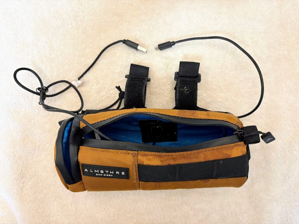 Almstre handlebar bag compact 3.5” diameter x 7.5” long. I use this bag to carry my 10,000 mAh battery, medical kit and a plastic spoon. I needed to route a USB cable to connect the battery to the Garmin/headlight. If I ran it through the zipper opening, rain and the resulting leak would ruin its content. I punched a hole through the body of the bag facing the stem where water would least likely to get to and pulled the cable through that hole. I’ve used this handlebar bag at Garden State brevets last May when it did rain and the inside remained dry. My only issue was insufficient space so recently I bought a larger bag from Almstre.